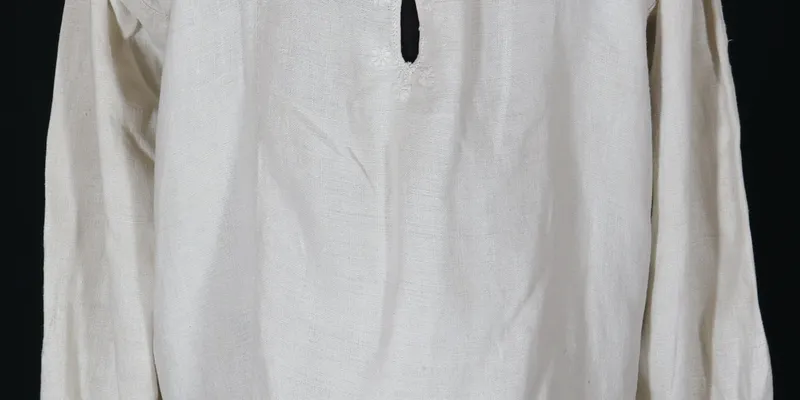 Men's shirt made of bleached homespun canvas. Stand-up collar. Collar and cuffs embroidered white-on-white with satin stitch.