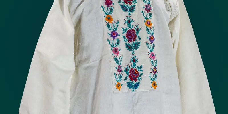 Men's kosovorotka shirt made of white fabric. Straight sleeve. Collar and sleeve bottoms decorated with red and black threads in a floral ornament. The placket is sewn with a multicolored ornament featuring a rose motif.