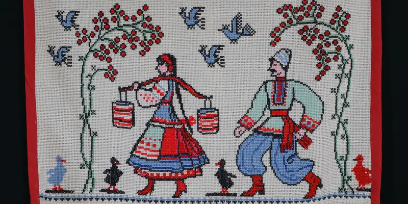 Rushnyk on white factory canvas, embroidered with colored threads. The rushnyk is embroidered based on the song 'Halia Carries Water.' The embroidery depicts a girl carrying a yoke and a boy following her. Near them are viburnum trees and birds sitting on branches or flying. Lines from the song are embroidered. Above the composition is a floral ornament. Below are embroidered household items: a teapot, cups, and saucers.