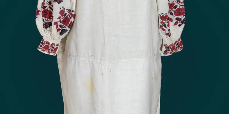 Women's shirt for a pidtychka, made of bleached canvas, embroidered with red and black threads. Floral ornament, with a garland of roses on the insert and a flower branch with leaves on the sleeves. Round neckline with a button fastening. Sleeves with cuffs.