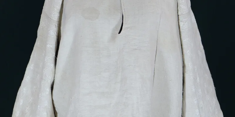 Shirt body made of bleached homespun canvas. Decorated with satin stitch embroidery.