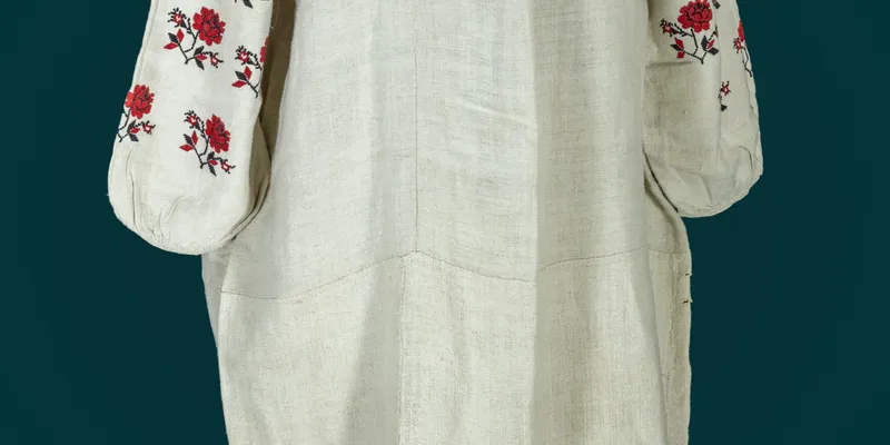 Shirt made of bleached homespun canvas. Body and insert gathered at the neck, round neckline. Sleeve with insert. Sleeves embroidered with red and black threads. Hem decorated with openwork mesh.