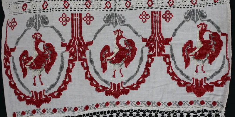 Rushnyk made of white factory fabric, embroidered with red and black threads. Ornithomorphic, floral, and geometric ornament. Tiered composition: two pairs of hens on branches; a strip of openwork mesh with a diamond-shaped ornament; three ovals depicting roosters; a thin strip with a broken branch. The edges of the rushnyk are sewn with lace featuring a geometric ornament with a diamond and wavy edge motif.
