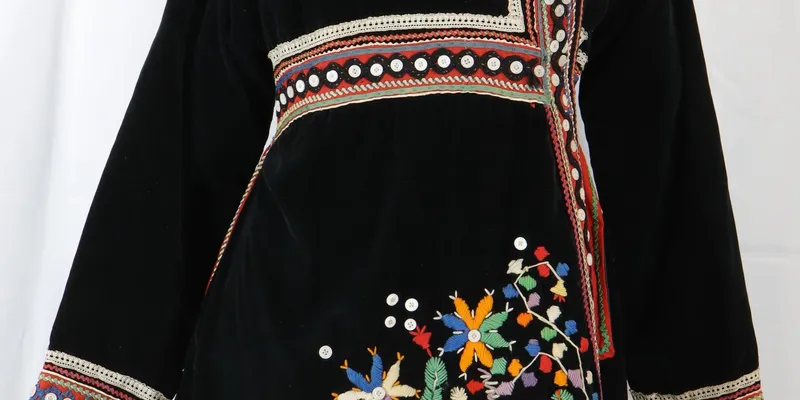 Long skirt made of black factory fabric (manchester). The back is cut off, with the hem gathered in fine pleats. Decorated with woolen thread embroidery on the right panel. The ornament is floral, in the form of a flower branch with red, orange, green, blue, purple, and white threads. The right panel, sleeve hem, and waistband are decorated with red and green ribbons, lace, and buttons. The buttons are round, white, and plastic. The skirt has a lining of burgundy factory fabric with white branches and homespun canvas.
