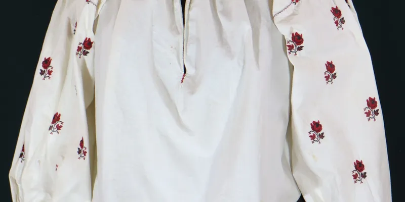 Shirt made of white factory fabric. The sleeve is long with an insert sewn along the warp and a gusset, gathered densely at the bottom under a cuff with a fastening of 1 button and 1 buttonhole. The neckline is round, densely gathered under a narrow binding with 2 buttonholes at the edges, with a slit at the center front. The shirt is decorated with a stylized floral-geometric ornament, embroidered with black and red threads with a slight addition of white threads. The neckline binding is embroidered with a chain stitch, and the chest slit is secured at the bottom with a worm stitch. The sleeve is decorated with scattered rose branches with leaves and buds and one row of puffs at the top edge. The insert is embroidered with a garland of roses with leaves and buds. The joints of the insert with the sleeve and shirt body are decorated with a worm stitch and highlighted with a chain of flowers. The cuff is decorated with a similar ornament.