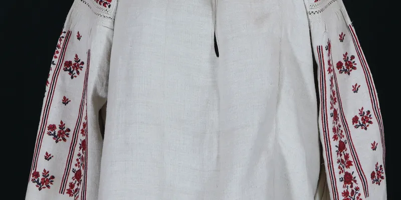 Shirt with a straight silhouette, bodice (to the waist). Sewn from three panels. The sleeve is three-quarter length, with an insert along the warp and a gusset. The long sleeve is gathered at the cuff, decorated at the top with 6 rows of puffs. The body and sleeve panels are gathered near the neck. The neckline is round, finished with a binding, with a slit at the center front. The neckline, insert, and sleeve are embroidered with red and black threads, with floral and geometric ornaments. The inserts have a horizontal stripe of flowers; the sleeves have 5 vertical stripes with rose and small flower embroidery.