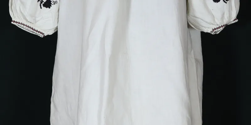 Women’s long-length shirt. The neckline is round. The sleeve has an insert, gathered at the bottom with a narrow embroidered strip. Embroidered with red and black threads, the inserts and sleeves feature a berry and strawberry leaf ornament. The hem is decorated with openwork.