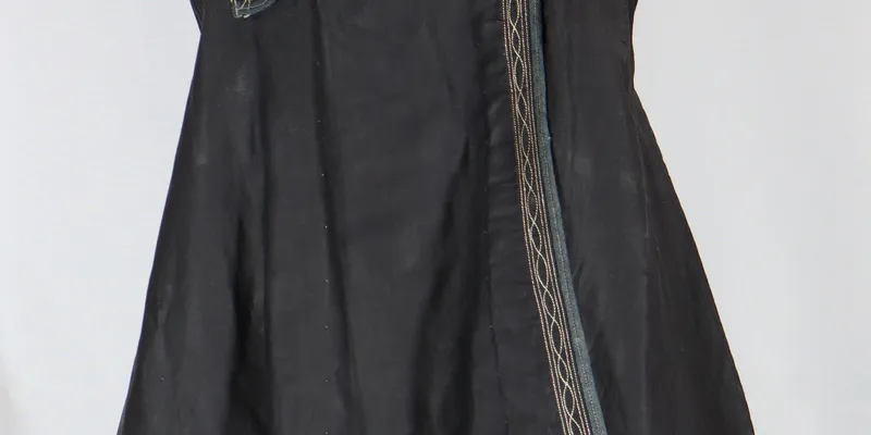 Korsetka made of black satin fabric, cut off at the waistline at the back, with "tails." The back at the waist is decorated with a strip of fabric and buttons. The neckline, right panel, and sleeves are decorated with yellow and orange machine stitching.