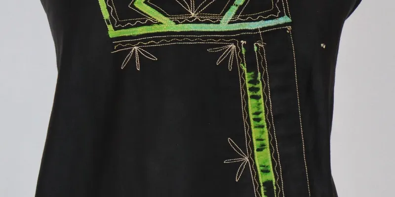 Korsetka made of black satin fabric, cut off at the waistline at the back, with 5 tails. The back at the waist is decorated with ribbons and metallic ribbons. The panels are decorated with ribbon and decorative green and white stitching. Legend: belonged to Seredyna A.E., a resident of Okhoche village, Novovodolazkyi district.