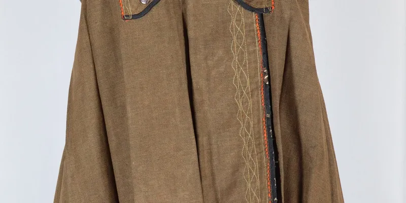 Korsetka made of brown factory fabric, cut off at the waistline at the back, with tails. The back at the waist is decorated with red braid. The panels are decorated with figured braid and machine stitching. Fastened with 10 buttons.