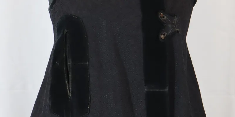 Korsetka made of black fabric, cut off at the waistline at the back, with 5 tails. The panels, hem, and pocket are decorated with black plush.