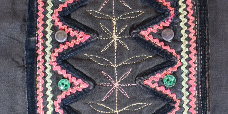 Korsetka made of black satin fabric, cut off at the waistline at the back, with "tails." The armholes and right panel are trimmed with red and green ribbons. The armholes, hem, and right panel are decorated with pink machine stitching. The ornament is floral. Legend: Belonged to Bardakova Anastasia Stepanivna, a resident of Andriivka village, Balakliya district.