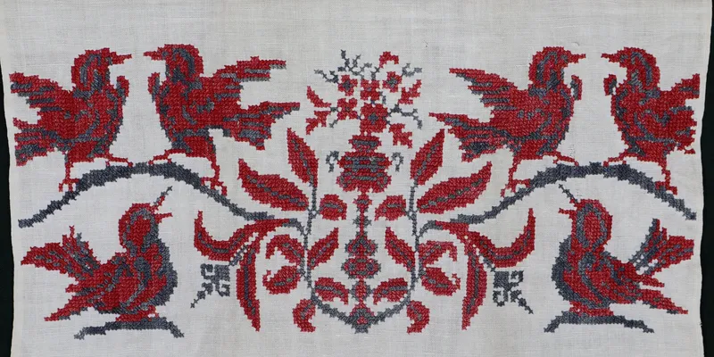 Rushnyk made from white factory fabric, embroidered with red and black threads. The ornament is floral and ornithomorphic with added text embroidery. The composition is tiered. At the top, the letters 'UH' are embroidered, below them a bird on a branch on each side, and further down two stripes with wavy branches featuring many birds. Lace is sewn along the edge.