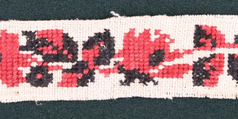 Embroidery sample on bleached homespun canvas, embroidered with red and black threads using the cross-stitch technique. The ornament is floral, in the form of a flower branch.