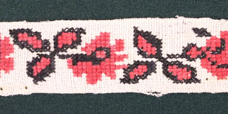 Embroidery sample on bleached homespun canvas, embroidered with red and black threads using the cross-stitch technique. The ornament is floral, in the form of a flower branch with leaves.