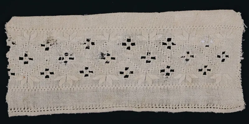 Embroidery sample on bleached homespun canvas, openwork. The ornament is geometric. Legend: part of the collection of the Sloboda Ukraine Museum named after H.S. Skovoroda.