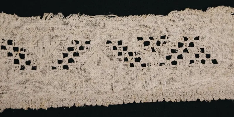 Embroidery sample on bleached homespun canvas with white threads, featuring openwork. The ornament is geometric.