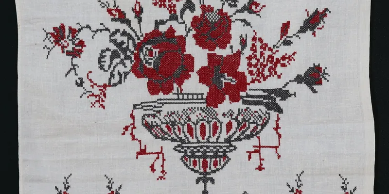 Rushnyk made of bleached canvas, embroidered with red and black threads. The ornament is floral. The composition is tiered: a bouquet of roses in a vase, below which are two stripes of rose garlands, with rhombus-patterned lace in between. The edges are sewn with lace featuring a floral ornament. Legend: embroidered by a resident of Vasylyshcheve village.