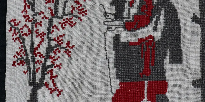 Rushnyk made of bleached canvas, embroidered with red and black threads. The composition is narrative, titled 'Parting.' It depicts a woman and a man leaving near a fence, with trees on both sides. Above them is the inscription 'Parting,' and higher, 'MP.' Below the composition is the text: 'As my heart beats, my Hryts went to China, maybe he will return to me.' Along the edge is a stripe of floral ornament in the form of a wavy branch. The edge is finished with openwork.