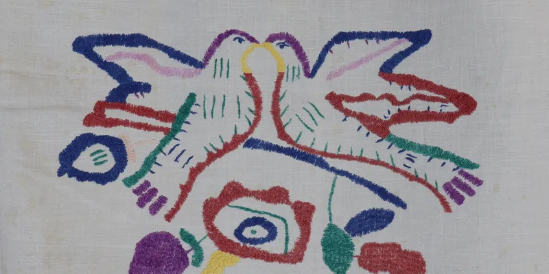 Rushnyk made of bleached fabric, embroidered with green, blue, yellow, lilac, pink, and brown threads. The ornament is floral and ornithomorphic. The composition is tiered, featuring two doves on a branch with a flower, below which are three large flowers. The edges are decorated with lace featuring a rhombus ornament and a scalloped edge.