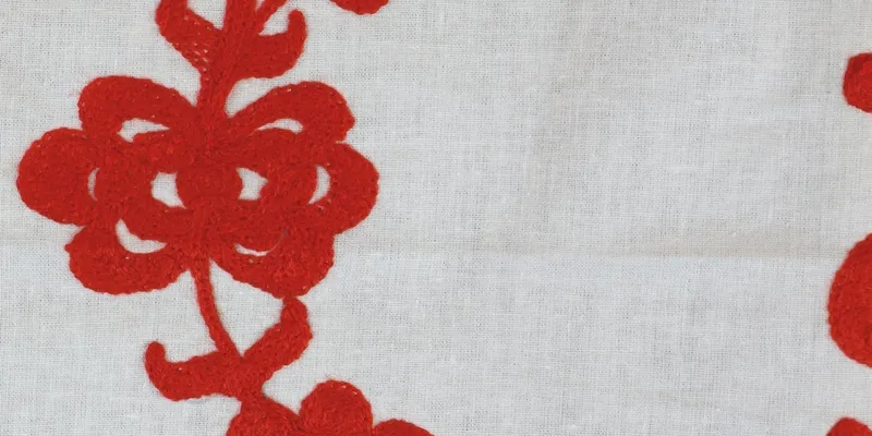 Rushnyk made of cotton fabric, embroidered with red threads. The ornament is floral with added text embroidery.