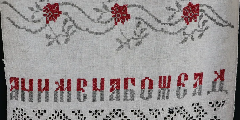 Rushnyk (fragment) made of bleached homespun canvas, embroidered with red and black threads. The ornament is floral with added text embroidery. The tiered composition consists of three stripes of floral ornament, three stripes of text ornament, and four stripes of openwork. The edge is finished with handmade lace.