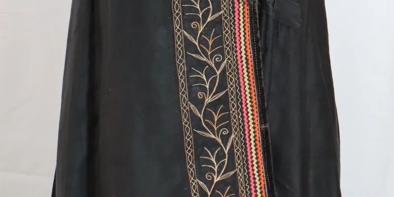 Korsetka made of factory cotton fabric with 7 tails at the waist, decorated with buttons in two rows. Decorated with braid and decorative machine stitching. The ornament is floral. Lined with homespun canvas.