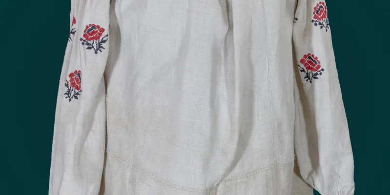 Shirt with a straight silhouette 'to the hem.' The upper part is sewn from finer canvas, the lower from coarser canvas. The bodice and hem are sewn from six panels. The sleeve is straight with a gusset and inset sewn along the warp, gathered at the bottom into small folds using the 'sewing to the collar' technique, on a narrow cuff with a double overcast stitch, decorated at the top with 'puffy' gathers (9 cm long). The sleeve and inset are sewn with a double overcast stitch. The bodice and inset are gathered near the neckline into small folds using the 'sewing to the collar' technique. The neckline is oval, with a central slit on the front, finished with a narrow cuff with a triple overcast stitch and two slit loops on both sides of the cuff. The cuff near the loops is decorated with 'obmetytsia' (plakhtove finishing) in red threads (6 cm on each side of the cuff). The shirt is decorated with embroidered black-and-red floral pattern. On the inset, a narrow stripe of a pattern with stylized flowers with branches and leaves in the form of crosses and circles (1 cm wide), above it — a stripe of embroidery with roses with branches, leaves, and buds. On the sleeve — a scattering of roses with branches and leaves. The connecting seams of the shirt end near the hem with a lace-like stitch type 'horodky' (5 cm). The hem is hemmed with a 'single column.' Legend: Found during an ethnographic expedition by the Kharkiv Historical Museum.