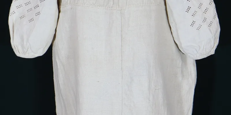 Shirt with a straight silhouette 'to the hem.' The bodice and hem are sewn from six panels of homemade canvas. The sleeve is straight with a gusset and inset sewn along the weft, gathered at the bottom into small folds, on a narrow cuff (0.5 cm wide) decorated with a double overcast stitch. The bodice and insets are gathered near the neckline into dense gathers using the 'sewing to the collar' technique. The neckline is oval, with a central slit on the front, finished with a narrow cuff sewn with a double overcast stitch. At the ends of the cuff, there are two slit loops for a ribbon. The insets and sleeves are embroidered in 'white on white' with hand-spun bleached linen threads using the techniques of straight satin stitch and cutting in geometric and geometric-floral patterns. On the inset and upper part of the sleeve, a horizontal stripe of a pattern in the form of a broken branch with geometric four-petaled flowers and leaflets attached at an angle, rhythmically repeated. In the upper part of the sleeve, a pattern of diamonds and half-diamonds, framed by outlines. Along the sleeve, seven vertical stripes of geometric-floral pattern repeat the inset's design. The hem is decorated with two parallel stripes of openwork with overlay (1 cm and 4 cm wide). On the second openwork, a winding branch with leaflets and flowers is embroidered. The openwork is made with homemade bleached and gray-dyed threads.