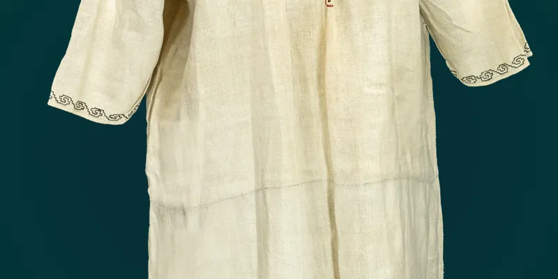 Straight-cut 'do pidtochky' shirt, body and lower part sewn from two panels each, laid across. The sleeve is three-quarter length, tapered at the bottom, even at the end, with an insert sewn along the weft. The sleeve and insert on the back side are sewn with a double 'vystih' stitch. The body and inserts are gathered near the neckline into fine pleats using the 'sewing to the collar' technique. The neckline is 'kare' (square) with a central front slit (25 cm long), finished with a narrow hem with a double 'vystih' stitch, a loop buttonhole on the right, and a transparent plastic button on the left. The shirt is decorated with black and red geometric and floral embroidery. The insert and upper sleeve feature horizontal stripes of identical patterns with connected branches, berries, and leaves. The sleeve hem has swirls embroidered with 'shtapivka.' The neckline hem has a single-color border of 'double cross-stitches' in a broken line (red threads). A red chain stitch of 'cross-stitch' is laid around the armhole.