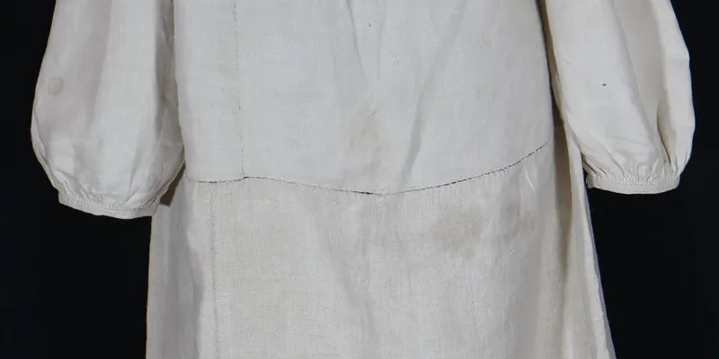 'Do pidtochky' shirt made of bleached hemp canvas, sewn from six parts. Straight silhouette. The sleeve is one-piece, sewn along the warp, straight with a gusset, gathered at the bottom, and finished with a hem. The body and upper sleeve edges are densely gathered near the neckline. The neckline is oval with a central slit, finished with a narrow hem. The hem has two slit buttonholes for a ribbon. The shirt is embroidered with red and black woolen threads in a floral pattern using the 'cross-stitch' technique. The shoulder area has a narrow horizontal pattern stripe of a straight line (stem) with small stylized flowers and leaves attached on both sides. The floral pattern is framed on all four sides by two rows of 'cross-stitches.' Below, the sleeve field features scattered five-petal flowers with leaves and swirls. The hem is decorated with a geometric pattern of a broken line with extensions, made with the 'cutting' technique using bleached hemp threads. At the bottom near the connecting seams of the lower part, there is a thin vertical stripe of stylized floral pattern (8 cm high), made with the 'cross-stitch' technique in red and black woolen threads.