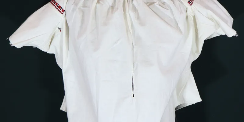 Straight-cut 'stanok' shirt, sewn from two parts. Short, straight sleeve with a gusset and insert sewn along the warp, decorated at the top with 'pukhlyky' (4.5 cm long). The body and inserts are gathered near the neckline into fine pleats using the 'sewing to the collar' technique. The neckline is round with a central front slit (30 cm long), finished with a narrow hem, fastened with a loop buttonhole (right) and a small button (left). The slit is secured in two places. The shirt is decorated on the insert with two rows of fine floral-geometric patterns made with black and red threads (stylized flowers and slanted diamonds connected together).