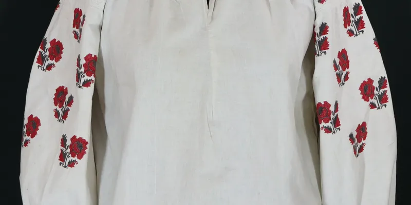 Straight-cut 'stanok' shirt, sewn from three panels. Straight sleeve without a gusset, with an insert sewn along the weft, gathered at the bottom on a cuff (3 cm wide), fastened with a loop buttonhole and a mother-of-pearl button. The body and inserts are gathered near the neckline. The neckline is round with a central front slit (14 cm long), finished with a standing collar (2.5 cm wide) fastened with a button. The shirt is decorated with floral and geometric patterns in black and red threads. The inserts feature two horizontal pattern stripes: a garland of roses with branches and leaves, and above it, a stripe of five separately placed flowers with a branch and leaves. The sleeve has roses with branches and leaves arranged in a checkerboard pattern in four rows. The cuff is decorated with a geometric pattern (diagonal crosses, squares, framed by straight stripes with 'pyramids').