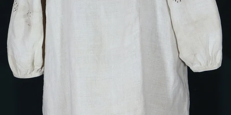 Shirt with a straight silhouette, 'extended.' Sewn from three panels. The sleeve is straight with a gusset and an insert, sewn along the warp, gathered at the bottom into a narrow band. The body and inserts are gathered at the neckline into small pleats using the 'sewing to the collar' technique. The neckline is square with a slit in the center front, finished with a narrow band. The slit is hemmed with a decorative 'retyaz' stitch. The ends of the band have two loop buttonholes (for a ribbon). The shirt is decorated with geometric and geometrized floral ornaments, embroidered in 'white on white.' The insert has a narrow horizontal pattern stripe consisting of zigzag lines with semi-flowers in the recesses. It is framed on both sides by straight lines with rhythmically repeating semi-flowers. The upper part of the sleeve has a wide pattern of 'keys,' semi-diamonds, and geometrized semi-flowers. The sleeve features a scattered pattern of geometrized semi-flowers with leaves. The hem is finished with a 'bar' stitch, decorated with a pattern of semi-diamonds with minimal filling. Above this pattern is another row of stylized flowers. The hem panels are joined with a 'retyaz' stitch. Legend: Found during an expedition.