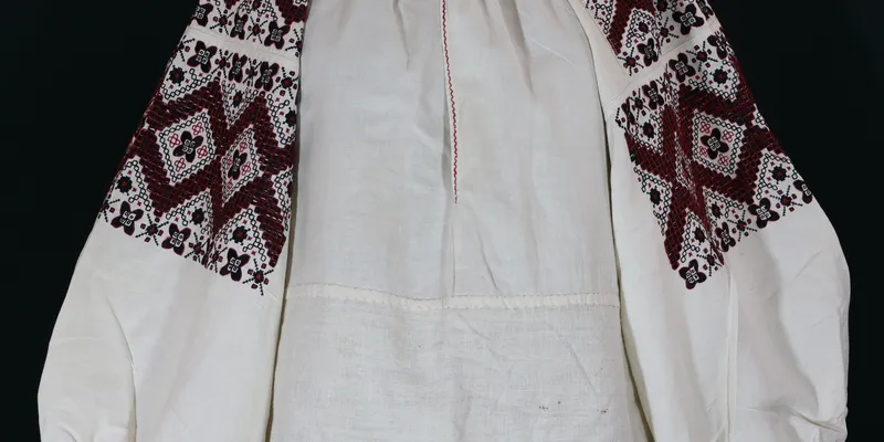 Women's shirt 'stanok' (to the waist). Straight silhouette, made from two panels, with a 15 cm coarser fabric attached at the bottom. The sleeve is long, wide, with an insert sewn along the warp, with a gusset, gathered at the bottom into small folds, and finished with a 0.5 cm wide trim. The body and inserts are gathered at the neckline using the 'sewing to the collar' technique. The neckline is round, with a 28.5 cm slit at the center front, fastened with a button. The inserts, sleeves, and neckline trim are decorated with embroidery in red and black floss threads, executed in the techniques of 'kachalochkova lyshtva,' 'shtapivka,' 'lyshtva,' 'cross-stitch,' 'double cross-stitch,' and 'stem stitch.' The sleeves and inserts feature two wide horizontal pattern bands consisting of diamonds and half-diamonds. Stylized geometric four-petal flowers are inscribed within the diamonds and half-diamonds, and the same flowers form the outline of this pattern. Provenance: The shirt belonged to Sotnikova Amalia Serhiivna, who lived in Kharkiv.