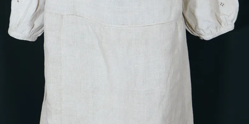 Straight-cut 'do pidtochky' shirt. The body is sewn from six panels. Straight sleeve with a gusset and insert sewn along the warp, decorated at the bottom with 'pukhlyky' and finished with a narrow hem. The body and inserts are gathered near the neckline using the 'sewing to the collar' technique. The neckline is round with a central front slit (26 cm long), finished with a narrow hem with two slit buttonholes at the edges. The shirt is decorated with floral-geometric and geometric patterns, embroidered in 'white on white' (insert, sleeve, hem) and red geometric pattern (hem). The insert and upper sleeve are embroidered with horizontal stripes of openwork and surface embroidery with diamond and triangle motifs ('cutting,' 'straight lyshtva'). The sleeve is decorated with a vertical 'branch' motif composition of three stems with leaves, separated by diamonds and four-petal flowers ('cutting,' 'stebnivka,' 'straight lyshtva'). The hem is hemmed with a narrow openwork stitch, parallel to which is a wide openwork stripe with a diamond pattern. Between the openwork stitches is a red zigzag line ('diagonal cross-stitch'). The body’s connecting seams at the hem are decorated with a red 'gorodky' openwork seam.