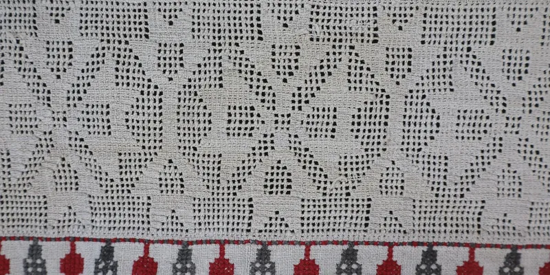 Rectangular valance sewn from bleached homespun hemp canvas. Decorated with strips of stylized floral ornament, embroidered with black and red zapoloch using the diagonal 'cross-stitch' technique, and a floral-geometric ornament embroidered white-on-white using the 'openwork netting' technique. The upper embroidery strip features a wavy branch with lilies and leaves, followed by a wide strip of white openwork netting with a floral ornament, highlighted by a narrow straight ribbon with black and red multicolored tassels. The bottom of the valance is adorned with narrow white scalloped lace with diamond-shaped stylized flowers in the recesses of the scallops. Provenance: Woven, embroidered, and lace crocheted by Bobonets Hanna Yukhymivna, a resident of the village of Pashchenkove, [Bohodukhiv] District.