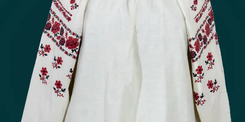 Shirt with a straight silhouette, 'body' (to the waist). Sewn from two panels. The sleeve is straight with a gusset and an insert, sewn along the warp, decorated at the bottom with 'puff stitches' gathered on a thread 1.5 cm from the edge to form a cuff. The sleeve and insert on the back side are sewn with a double 'stem stitch.' The body and inserts are gathered at the neckline into small pleats using the 'sewing to the collar' technique. The neckline is square with a 27.5 cm slit in the center front, finished with a narrow band with triple 'stem stitch' and two loop buttonholes on both sides. The slit in the center front is hemmed on the front side with a single 'stem stitch.' The shirt is decorated with a black and red floral ornament. The neckline band has a red cross-stitch chain, and the bottom of the sleeve has a black and red chain (1x1). The insert is decorated with an ornament embroidered along the seam line to the sleeve and back, consisting of three stripes: a garland of roses (1.3 cm wide), above which is a stripe of stylized flowers (0.5 cm wide), and above that, seven separately embroidered roses with branches and leaves. The upper part of the sleeve is decorated with a horizontally placed ornament: roses with branches, leaves, and buds, framed above and below by stripes of stylized flowers with branches and leaves. The sleeve has a checkered pattern of six-petaled flowers with branches and leaves.