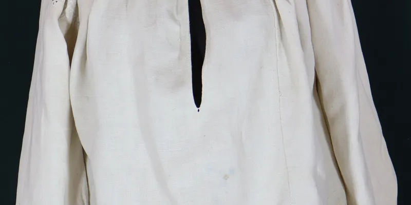 Straight-cut shirt, 'stanok.' The body of the shirt is sewn from three panels. The sleeve is one-piece with a gusset, finished at the bottom with a hem secured with coarse fasteners. The body and upper sleeve are gathered near the neckline into dense pleats using the 'sewing to the collar' technique. The neckline is round with a 30 cm slit in the center front, fixed at the bottom with a fastener. The neckline edge is finished with a narrow hem with two buttonhole loops at the edges for a cord. The shirt is decorated with stylized geometric patterns, embroidered in 'white on white' (shoulder area) and black and red zappolotch (neckline, connecting seams of the sleeve, gusset, and body). The shoulder area is decorated with a horizontal strip of ornament featuring diamond and triangle motifs, enclosed above and below with straight strips with attached 'spiders' and 'kupky' ('lyshtva straight,' 'cutting,' 'half-cross'). The neckline is decorated around its circumference with a strip of red ornament, bordered by black lines. The ornament consists of so-called 'keys' — S-shaped signs arranged horizontally, and triangles connected at their vertices ('nabiruvannya, zatyahanka'). The sleeve, gusset, and body on the back side are joined with a zigzag hemstitch seam, embroidered alternately with black and red threads ('cherv'yachok'). Legend: Belonged to Nataliya Vasylivna Kashcheyeva, a resident of Velykyi Burluk, Kharkiv Region, who made the shirt for her dowry.