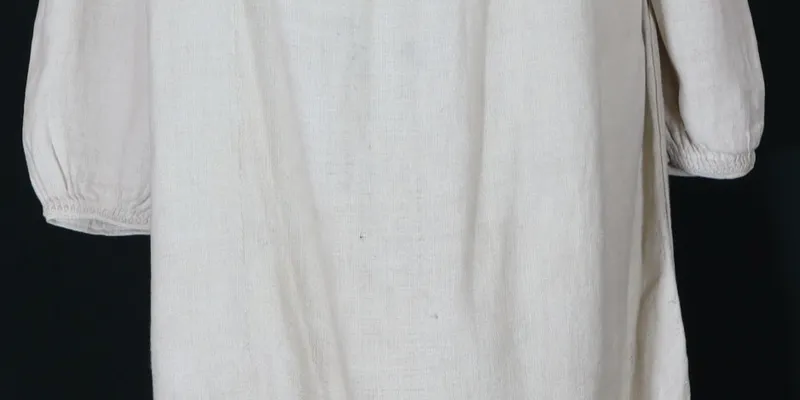 Shirt with a straight silhouette, 'dodiltna,' sewn from three panels of bleached homespun canvas. The sleeve is straight, one-piece with a gusset, gathered at the bottom with puffs. The body and sleeve are densely gathered at the neckline using the 'sewing to the collar' technique. The neckline is round with a slit at the center front. The sleeves are decorated with a geometric white-on-white ornament featuring a diamond motif. The hem is adorned with openwork netting. The edges of the canvas at the hem are decorated with a strip embroidered with red threads. Provenance: The shirt was found by the KhIM ethnographic expedition in the village of Tsybivka, Kupiansk District.